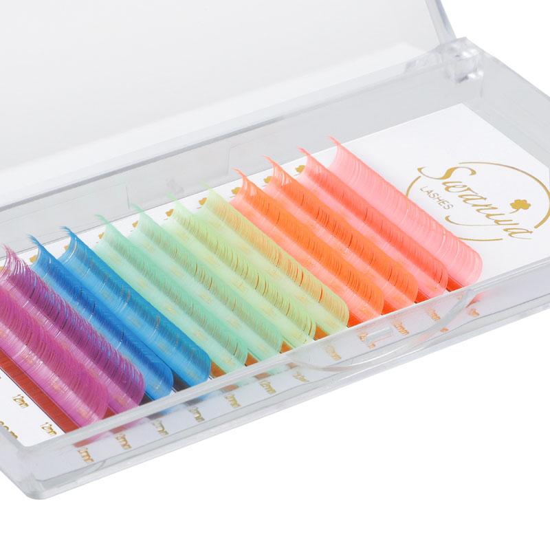 Swaniya Sambungan bulu mata berwarna -warni mempunyai warna ombre (ombre biru, ombre ungu, ombre merah jambu putih, dll), warna normal (merah, merah jambu, kuning, putih, hijau, biru, ungu, dll), warna neon.