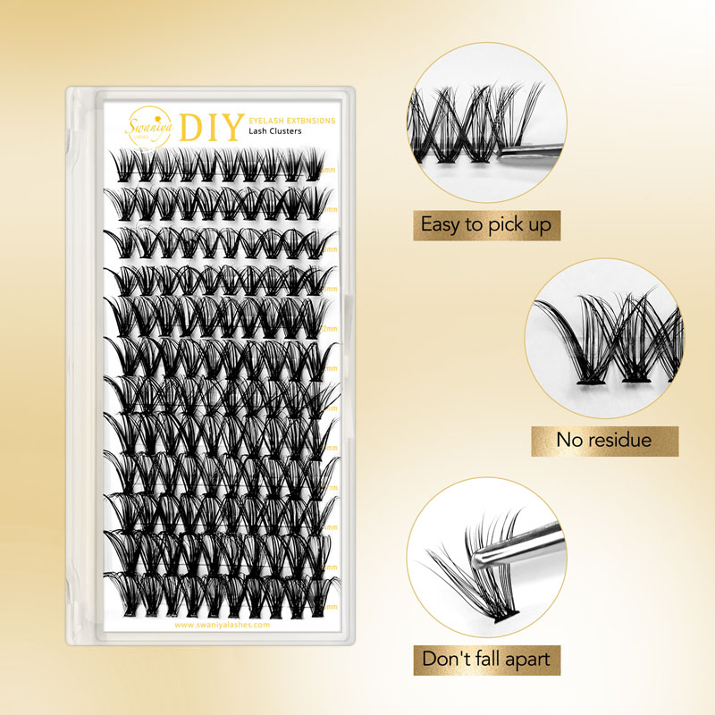 Kluster Swaniya Lash menawarkan ketahanan dan panjang umur yang lebih baik berbanding dengan bulu mata tradisional, memastikan anda mendapat yang paling banyak untuk wang anda. Selain itu, mereka datang dalam dulang yang boleh diguna semula yang boleh disimpan dengan mudah dan dibawa bersama anda di mana sahaja anda pergi.